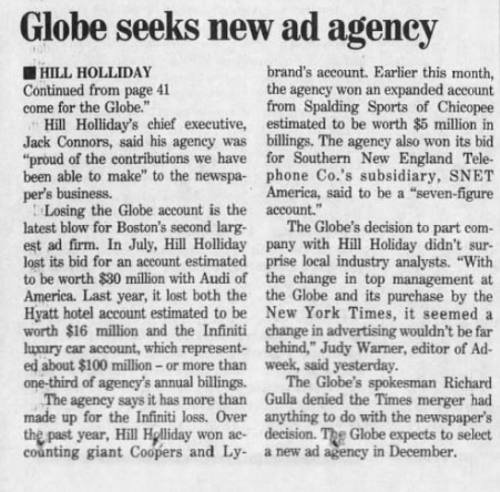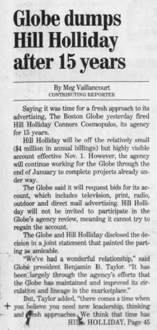 Favorite line: “The Globe and Hill Holliday disclosed the decision in a joint statement that painted the parting as amicable.”