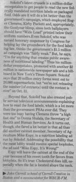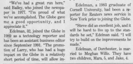 Bailey laid out the situation and Edelman, to his credit, said “Okay, let’s give it a go for six months.” The deal was that I had to quit Adweek, refrain from writing for other Globe sections, and restrict any freelancing to radio commentaries. All of which I did.