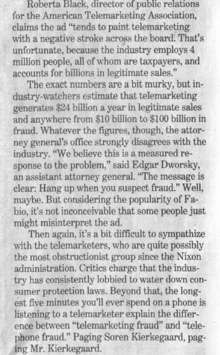 Then again, it’s a bit difficult to sympathize with the telemarketers, who are quite possibly the most obstructionist group since the Nixon administration. Critics charge that the industry has consistently lobbied to thwart government action and water down consumer protection laws. Beyond that, the longest five minutes you’ll ever spend on a phone is listening to a telemarketer explain the difference between “telemarketing fraud” and “telephone fraud.” Paging Søren Kierkegaard, paging Mr. Kierkegaard.