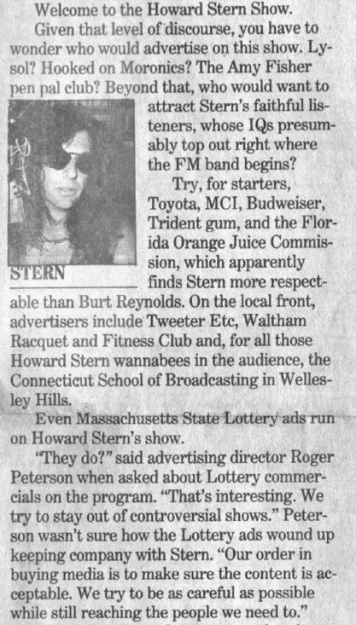 [Y]ou have to wonder who would advertise on this show. Lysol? Hooked on Moronics? The Amy Fisher pen pal club? Beyond that, who would want to attract Stern’s faithful listeners, whose IQs presumably top out right where the FM band begins?