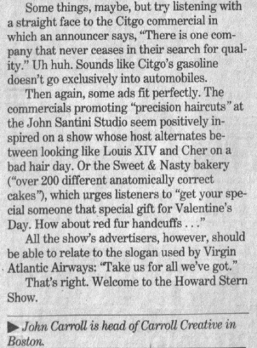 A couple of weeks after the column ran, I got a call from a radio monitoring service telling me I had been the subject of a segment on that morning’s Howard Stern Show and asking if I’d like a copy of it. I said no thanks – because the Stern show at that time was re-broadcast in Boston every night.