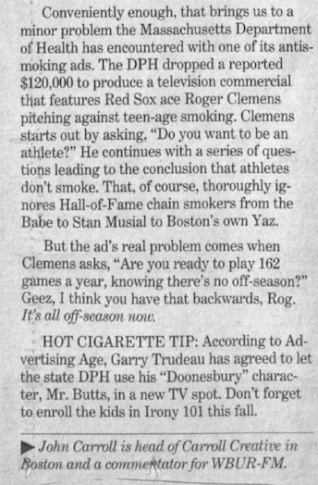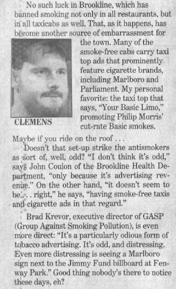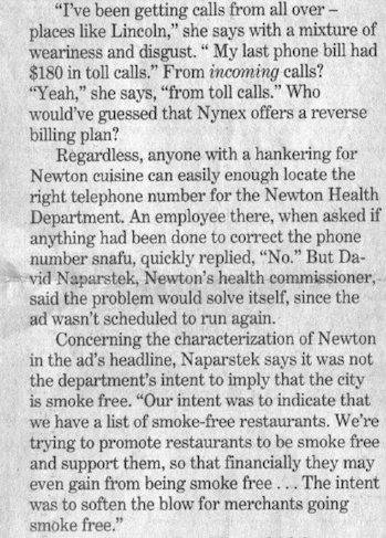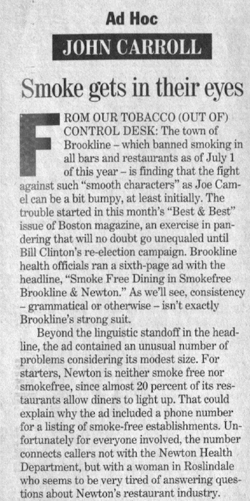 Also on the health front, 1994 saw the start of the anti-smoking jihad by the Massachusetts Department of Public Health. In addition to the DPH’s wave of anti-smoking ads, some of the Bay State’s more enlightened cities and towns started their own assault on the local tobacco-stained wretches.