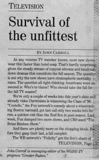 We’re only a couple of weeks into this year’s slate and already the Class of ’98 has joined sausage- and law-making as things not to watch. Luckily, video Darwinism is even now winnowing the herd through channel selection. “Costello” – the Fox network’s comedy about a wisecracking Boston barmaid – got last call only two weeks into its run, a quicker exit than the Red Sox in post-season . . .