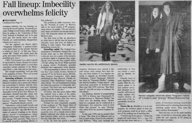 As any veteran TV watcher knows, most new television shows wear thin faster than hotel soap. That’s hardly surprising, given the steady stream of copycat sitcoms and hand-me-down dramas that constitute the fall season. The question is not why the new shows have a praying-mantis mortality rate. The question all right-thinking Americans want answered is: Who’s to blame? Who should take the fall for the fall TV season?