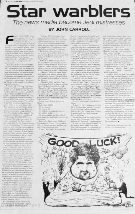 On the print side, I managed to publish this Boston Phoenix piece about the otherworldly hype for Star Wars: Episode I – The Phantom Menace.