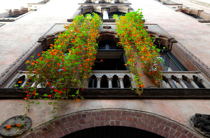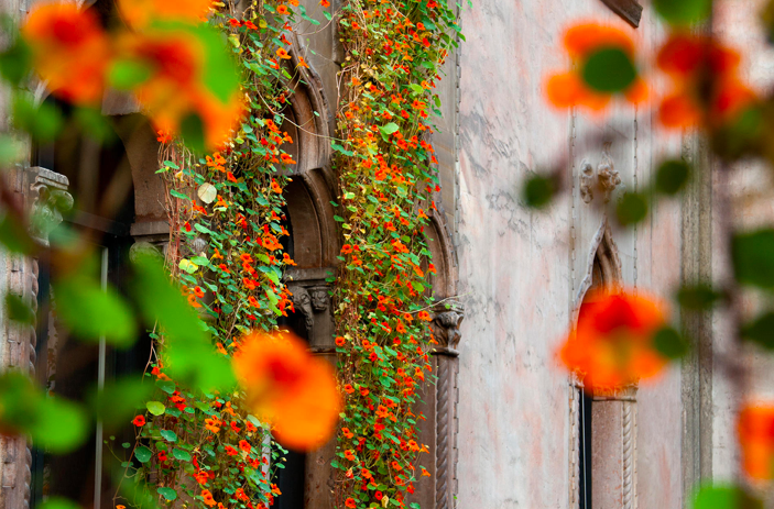 Cascades of flowering nasturtium vines make their brief—but dramatic—appearance above the courtyard, celebrating the arrival of spring at the Museum. (Nasturtium blooms last about three weeks.) The annual Hanging Nasturtiums display continues an annual tradition started by Isabella during the week before Easter, marking the return of color to the Fenway.