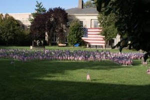 Peace and early morning sunshine have descended on a usually very busy Calkins Hall green at Hofstra. For the past week, students and staff have have been planting hundreds of American flags in remembrance of the heroes of 9/11, in the shape of our great country. We all know where we were on that day, on that moment.We remember the loved ones lost and the heroes who helped in recovery.