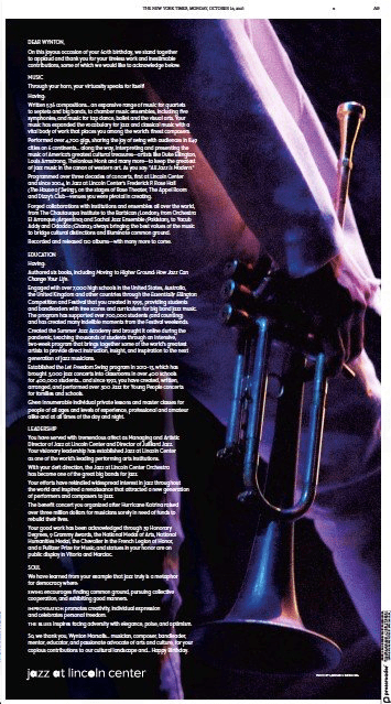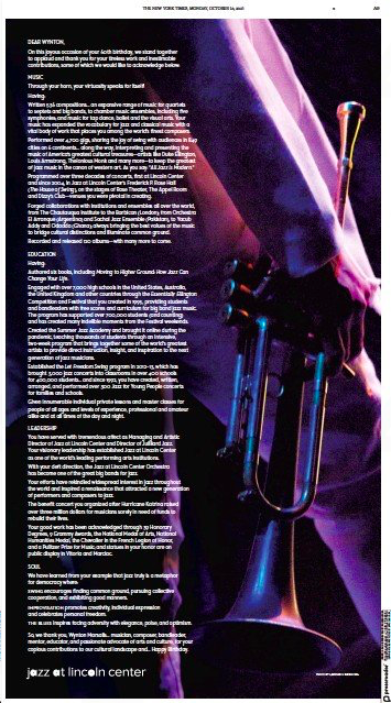 As the hardgrading staff noted yesterday, Jazz at Lincoln Center ran this totally unreadable full-page ad in the New York Times on Monday to celebrate Wynton Marsalis’s 60th birthday.