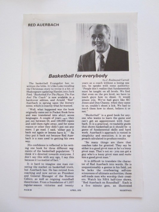Back in April of 1976, Auerbach was flacking a new book – Basketball for the Player, the Fan and the Coach – so he would pretty much talk to anybody, which happened to include even me.