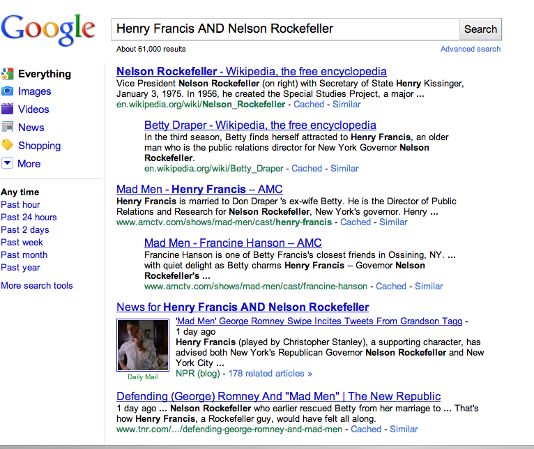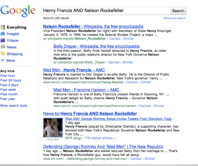 Let’s go to the Googletron first. Here’s what you get when you plug in Henry Francis AND Nelson Rockefeller: