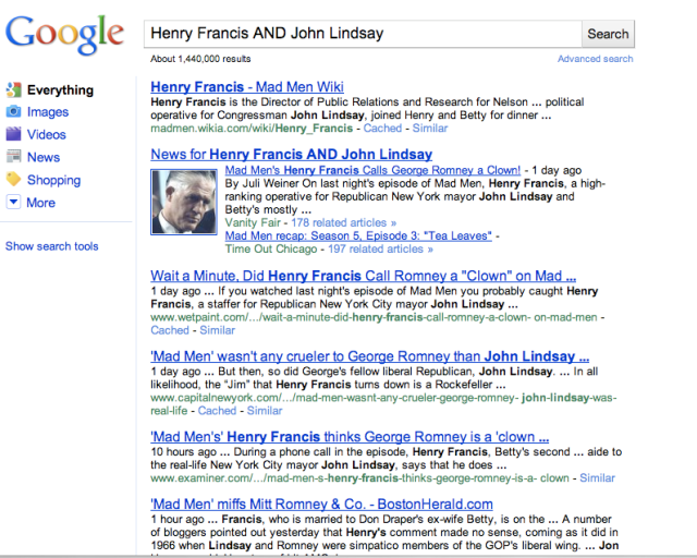 The hardworking staff got really confused on Sunday when the Mad Men character Henry Francis told a phone caller that New York Mayor John Lindsay would not do a joint appearance with Michigan Gov. George Romney “because Romney’s a clown and I don’t want [Lindsay] standing next to him.”