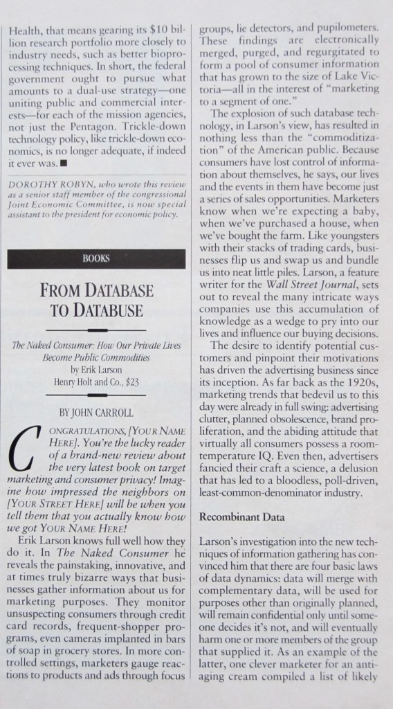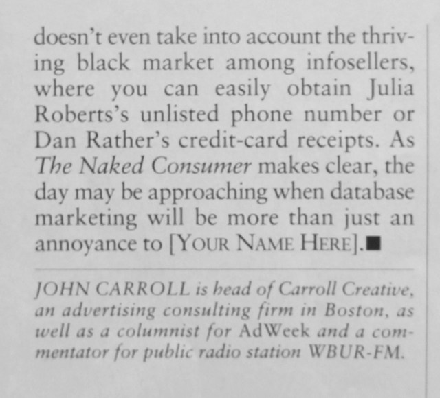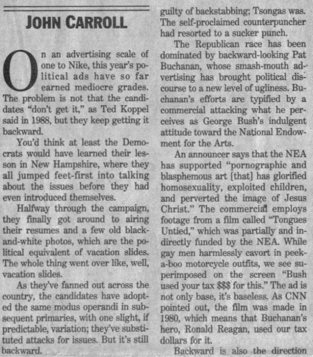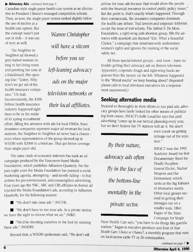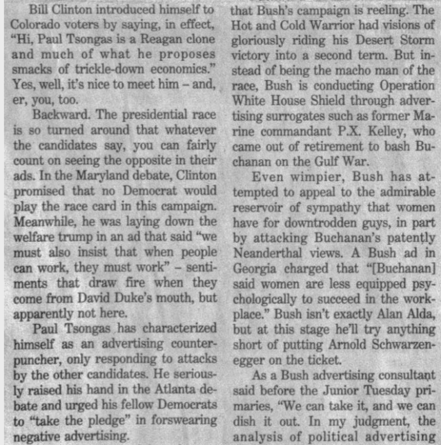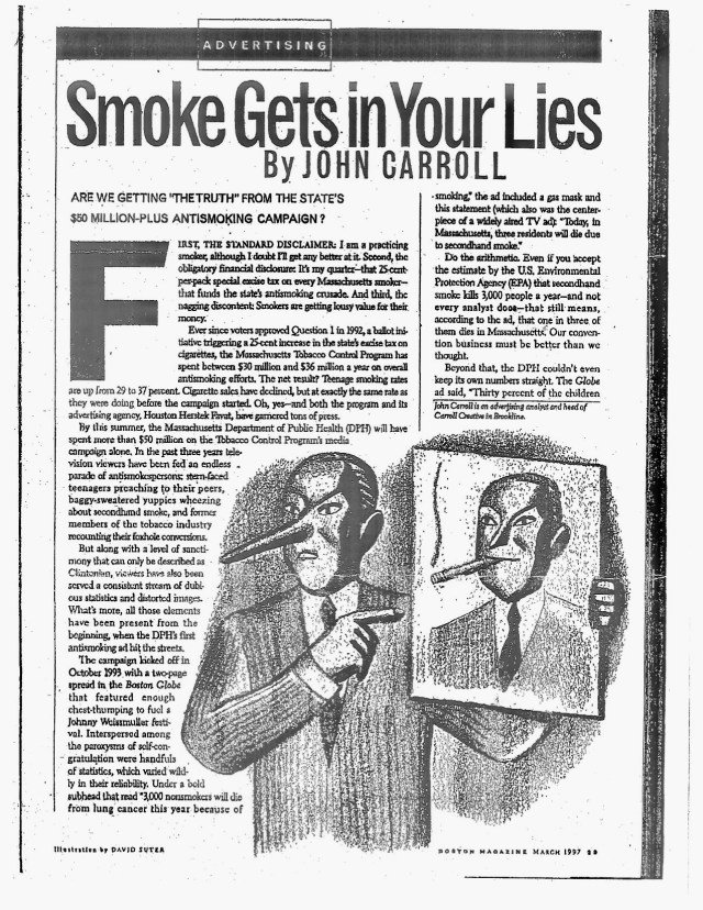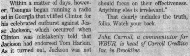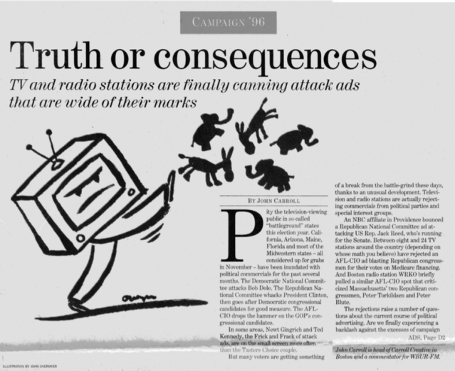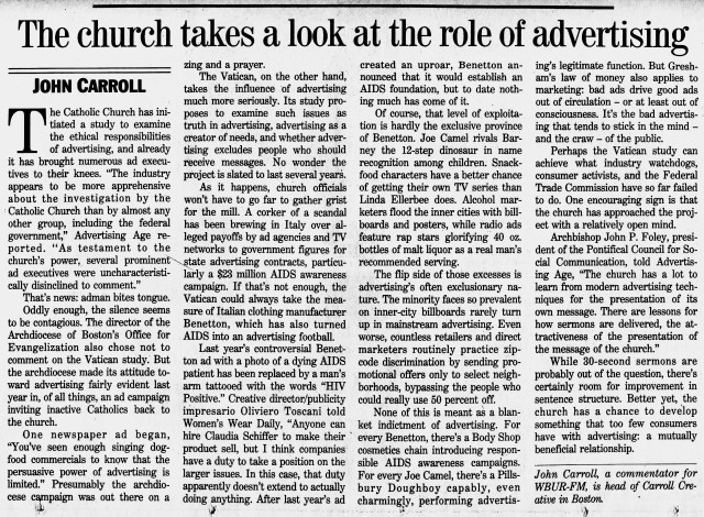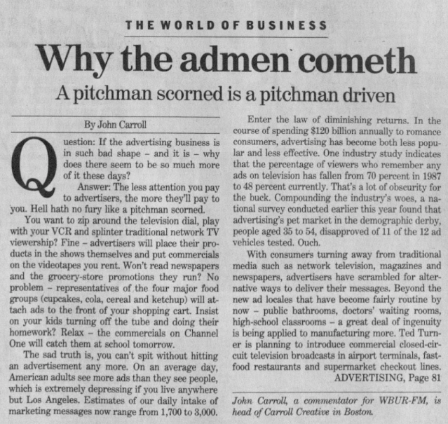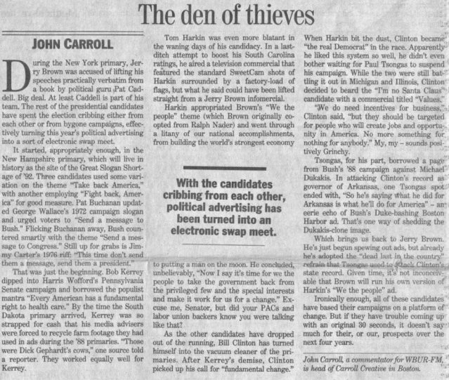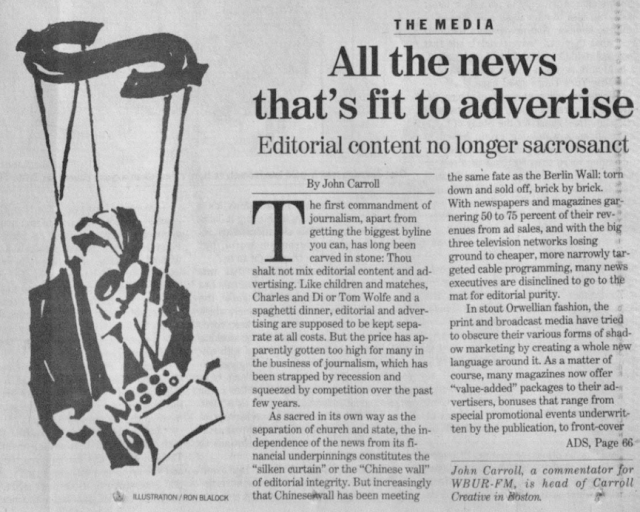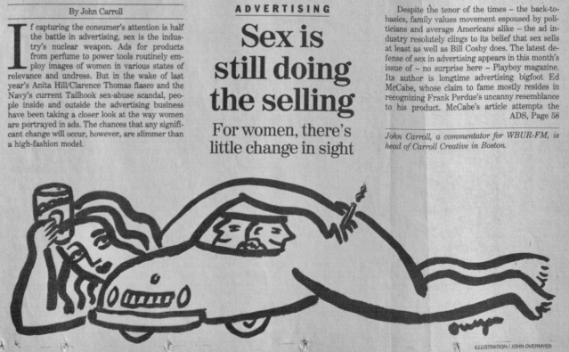 At the end of ’92 I began pitching Globe business editor Steve Bailey, with some initial success, such as this piece about the image problems the advertising industry suffered.