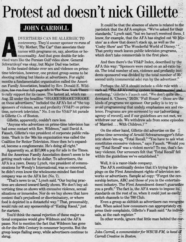 One ad included the AFA’s list of “the top sponsors of violence, sex and profanity (VS&P) on prime-time, network television.” Number 5 on the VS&P hit parade was Boston’s Gillette Company.