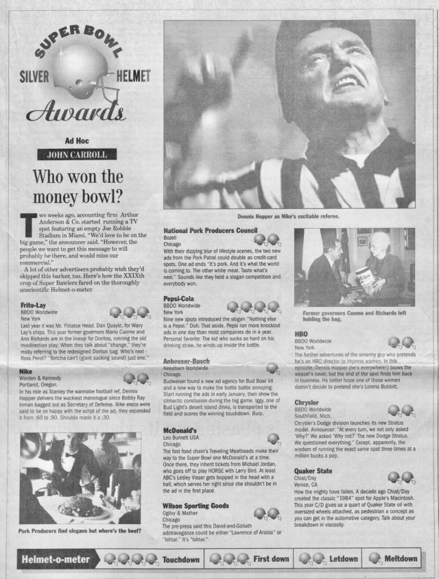 I also twice reviewed Super Bowl ads, filing in time for the next morning’s edition of the paper.