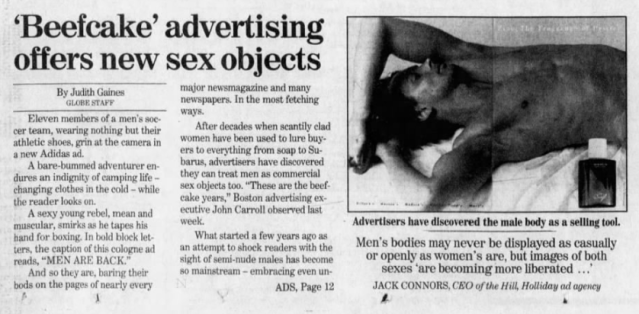 “This advertising is allowing men to discover how it feels to watch their kind paraded as headless heartthrobs and half-clothed ‘himbos,’ Carroll said. “Who’s going to protest? A support group for badly built guys?”